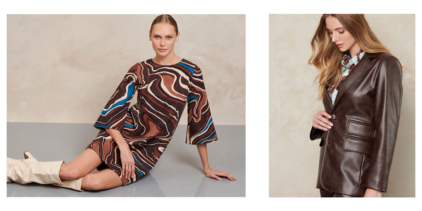 Φόρεσε ένα mini φόρεμα με abstract σχέδια, και ΄70s επιρροές, σε χαλαρή γραμμή. Συνδύασέ το με σακάκι από vegan δέρμα, σε σοκολατί χρώμα. Και ολοκλήρωσε με άνετες ψηλές μπότες σε ανοικτό μπεζ χρώμα. To αποτέλεσμα; Όλη η πόλη στα πόδια σου!