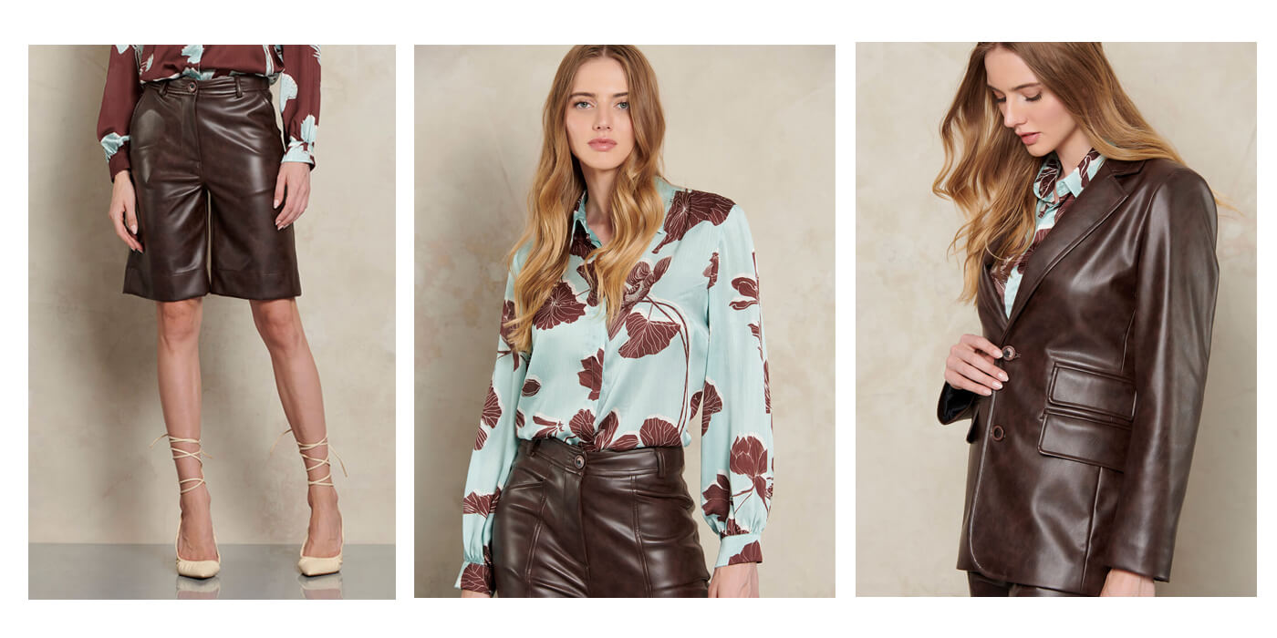 Εναλλακτικά, αντί για φόρεμα, φόρεσε βερμούδα από vegan δέρμα, στην ίδια ακριβώς απόχρωση με το σακάκι και συνδύασέ τα με floral σατινέ πουκάμισο, σε aqua τόνο. Εξίσου stylish και trendy!