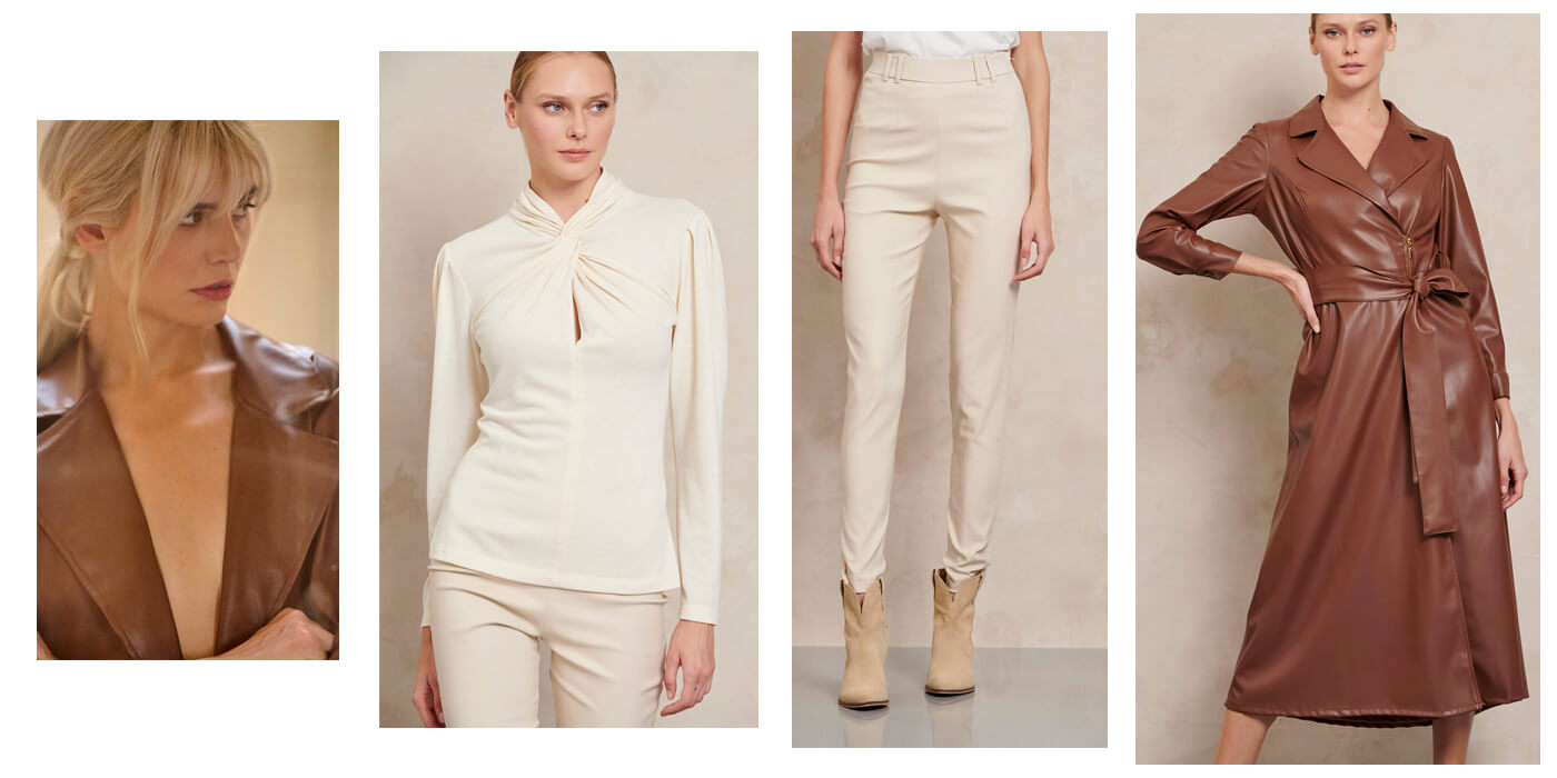 Και…τώρα η έκπληξη…ολοκλήρωσε το look σου με σταυρωτό φόρεμα (???) από vegan δέρμα, σε ταμπά χρώμα. Όχι, δε μπερδεύτηκα καθόλου. Είπα φόρεμα και το εννοώ. Η έκπληξη είναι στο ότι δε θα το φορέσεις ως φόρεμα, αλλά ως πανωφόρι. Θα το αφήσεις ανοικτό, με τη ζώνη να κρέμεται, σαν καμπαρντίνα.