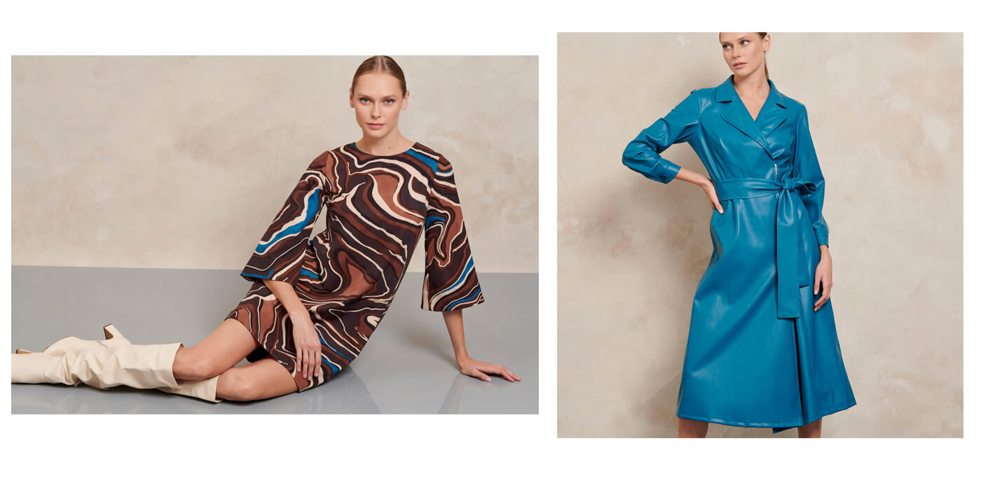 Συνδύασε το ‘70s φόρεμα που σου πρότεινα πιο πάνω, με το σταυρωτό φόρεμα δερματίνης (πάλι ανοικτό σαν καμπαρντίνα), αλλά στο πετρόλ χρώμα, που ταιριάζει ιδανικά με τους τόνους του φορέματος.